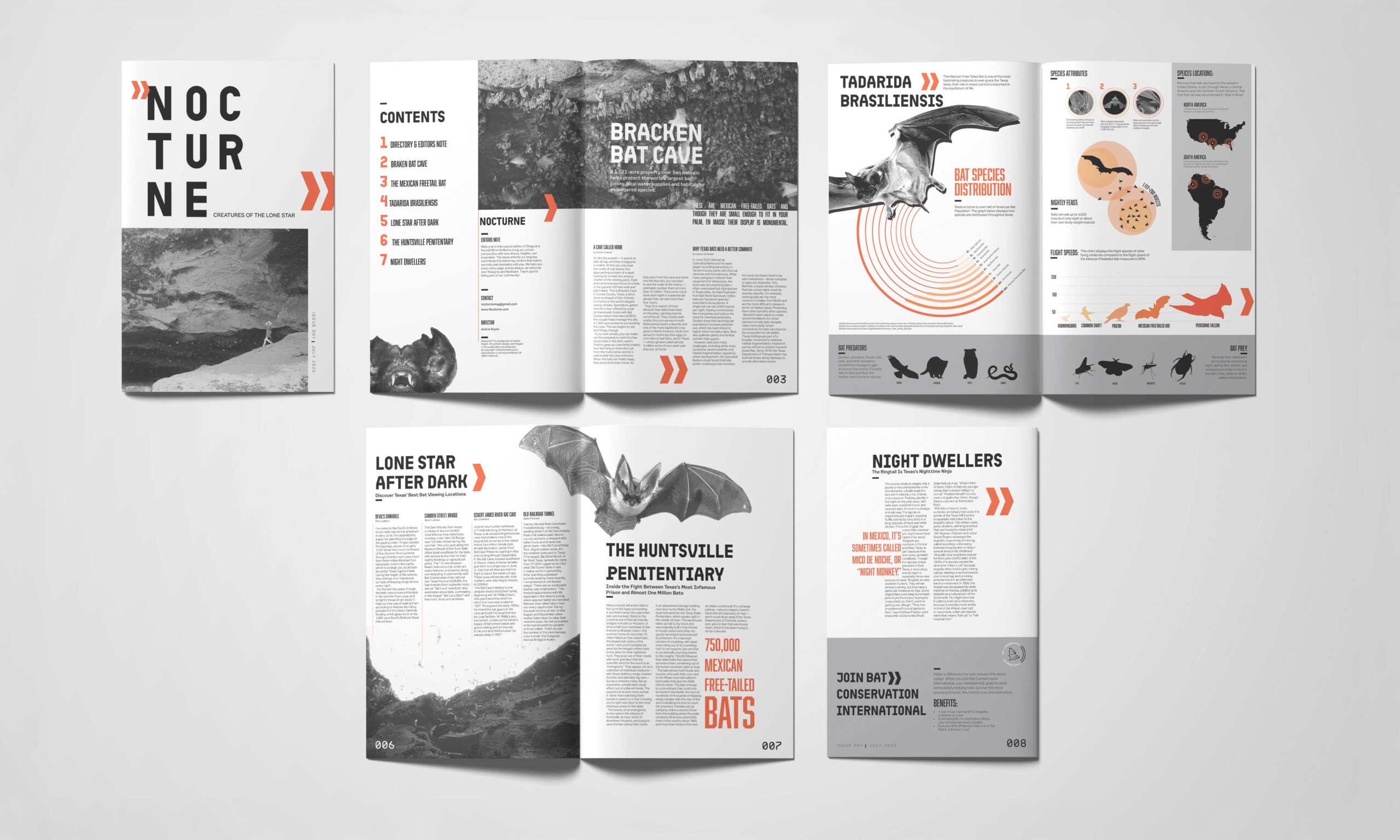Nocturne is a newsletter and infographic exploring Texas’s massive bat population. Designed for wildlife enthusiasts, the project utilizes a high contrast black and white palette with a vibrant orange spot color to guide the eye through complex statistical data. The layout balances dense editorial spreads with a cohesive visual narrative, highlighting the unique characteristics of the native Texas Brown Bat.